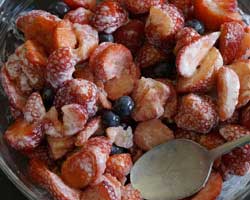 Fruit salad is a dish consisting of various kinds of fruit, sometimes served in a liquid, either in their own juices or a syrup. When served as an appetizer or as a dessert, a fruit salad is sometimes known as a fruit cocktail or fruit cup. In different forms fruit salad can be served as an appetizer, a side-salad, or a dessert.